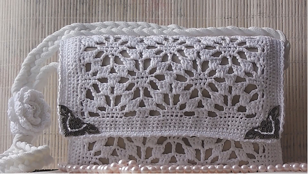 Сумочка гармонично сочетает хлопок белого цвета и плотную ткань. Светло-бежевая основа подчеркивает симметричный рисунок, дополняя правильные формы.