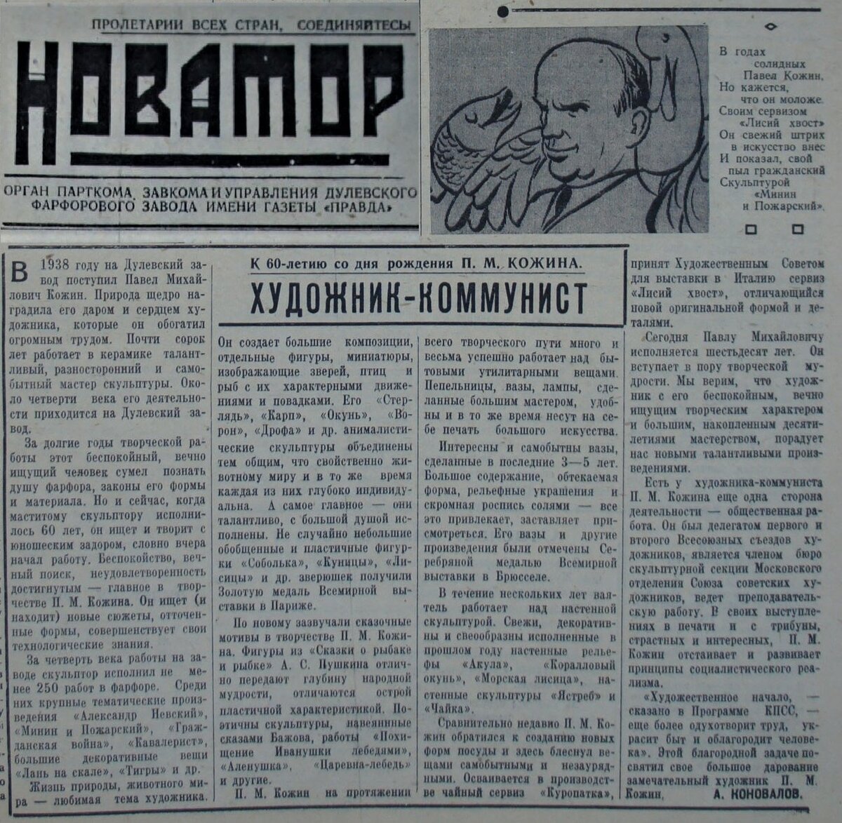 Коновалов А. Художник-коммунист. К 60-летию со дня рождения П.М. Кожина // Газета «Новатор», орган парткома, завкома и управления Дулёвского фарфорового завода им. газеты «Правда», 1964. – №3 (469) от 17 января. – С. 1. Ликино-Дулёвский краеведческий музей / КП № 768/3. Госкаталог: 18371493. Источник: goskatalog.ru