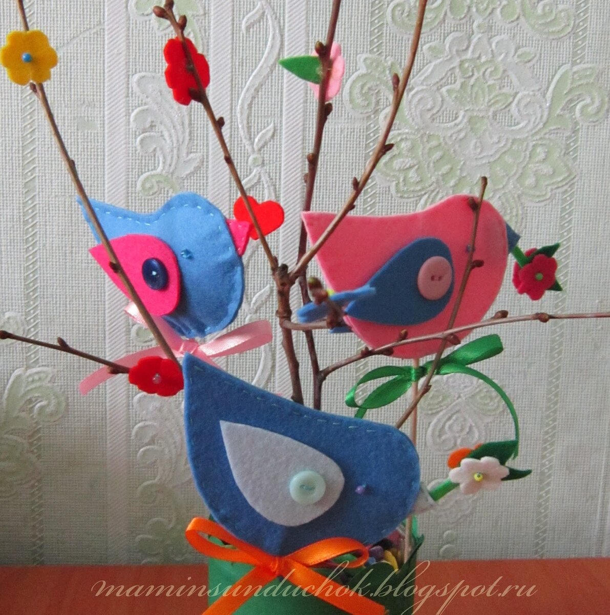 Поделка для детского сада. Шить таких птичек очень просто. Для работы понадобится жесткий фетр, пуговицы, нитки и немного наполнителя. Для изготовления птичек можно воспользоваться этой выкройкой. Выкраиваем по две детали туловища, крыльев и клюв. Сшить две детали клюва. К туловищу пришить пуговицы. На туловище наметить место расположение клюва. Сшить две детали туловища и пришить клюв. На крыльях разметить место расположения отверстий для пуговиц. Прорезать отверстия. В банке закрепить ветки. Ветки можно украсить цветами из фетра. Веточку и птичек закрепила с помощью цветных камешек