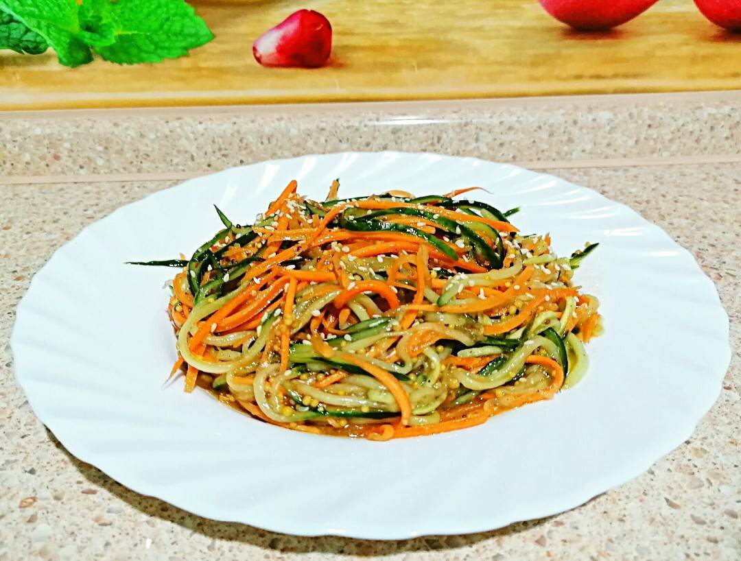 Ингредиенты: моркови🥕, огурцов🥒, Заправка:, горчицы в зернах "Махеев", молотого кориандра, молотой паприки, сахара, растительного масла, Чёрный молотый перец , Кунжут для украшения, чеснока, уксуса 9%, соли Способ приготовления: Морковь и огурец натираем на тёрке для корейских салатов. В овощи всыпаем все ингредиенты указанные в заправке кроме растительного масла. Не перемешивать. Раскаляем на сковороде растительное масло и вливаем масло на специи и быстро перемешиваем. И убираем в холодильник на пару часов. Перемешиваем через пару часов и украшаем кунжутом. Приятного аппетита!