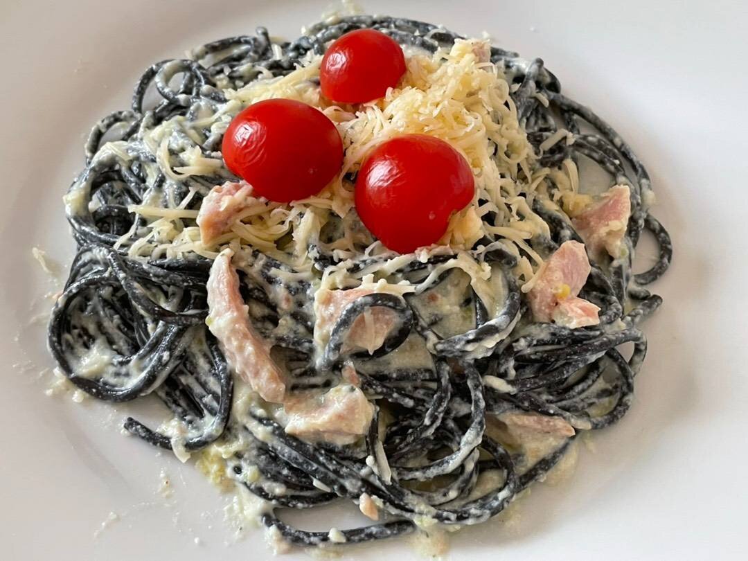 Ингредиенты: спагетти с чернилами каракатиц, банка консервированного тунца, чеснока, сливки 20% жирности, пармезан, помидора черри