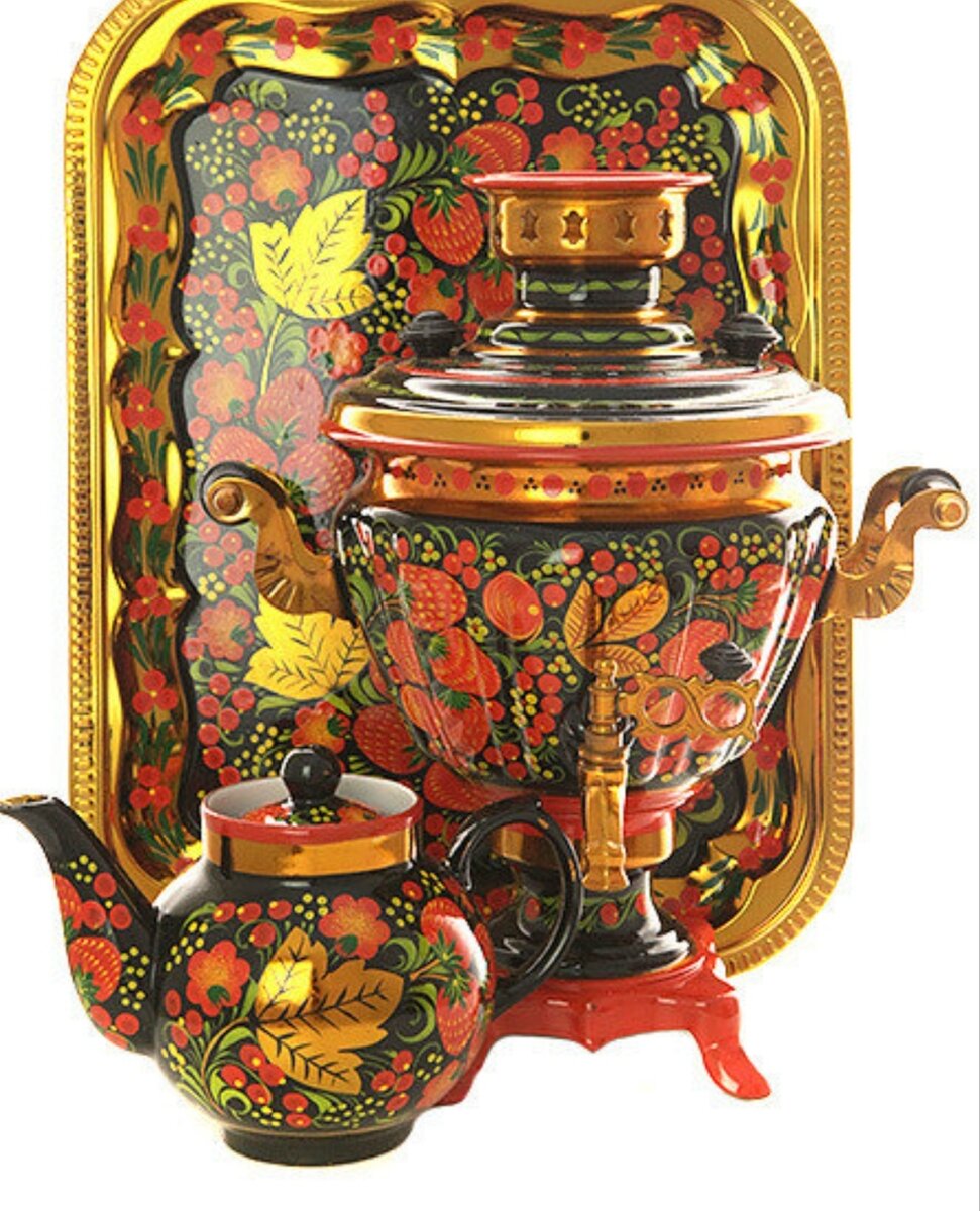 По публикациям Самарской газеты за 90 годы 20 века. На Руси чай стал известен с конца XVII века. Тогда а зажиточных домах его пили как лекарство. Только в 18 веке чай стал распространяться в России. Именно тогда, в 40-е годы, на уральском заводе Демидовых и были изготовлены первые самовары. Очень скоро они стали неотъемлемой частью русского быта. Удивительно разнообразны формы, украшения и размеры этих непременных спутников русского чаепития. Это самовары дорожные и трактирные, "чайники", "кофейники", "кухни", бульотки. В 19 - начале XX века были популярны самовары типа рюмки, банки, шара. Их изготовляли не только из латуни и меди ,но из стали, чугуна, бронзы и даже серебра. Признанными мастерами считались тульский рабочий точка они, кстати, изготовили в 1922 году самый большой самовар. Он весил 100 кг и вмещал 250 л воды. Корпус изготовлен из специального сплава цветных металлов, благодаря чему самовар "поспевал" за 40 минут, А вода не отставала в нём двое суток. Это с