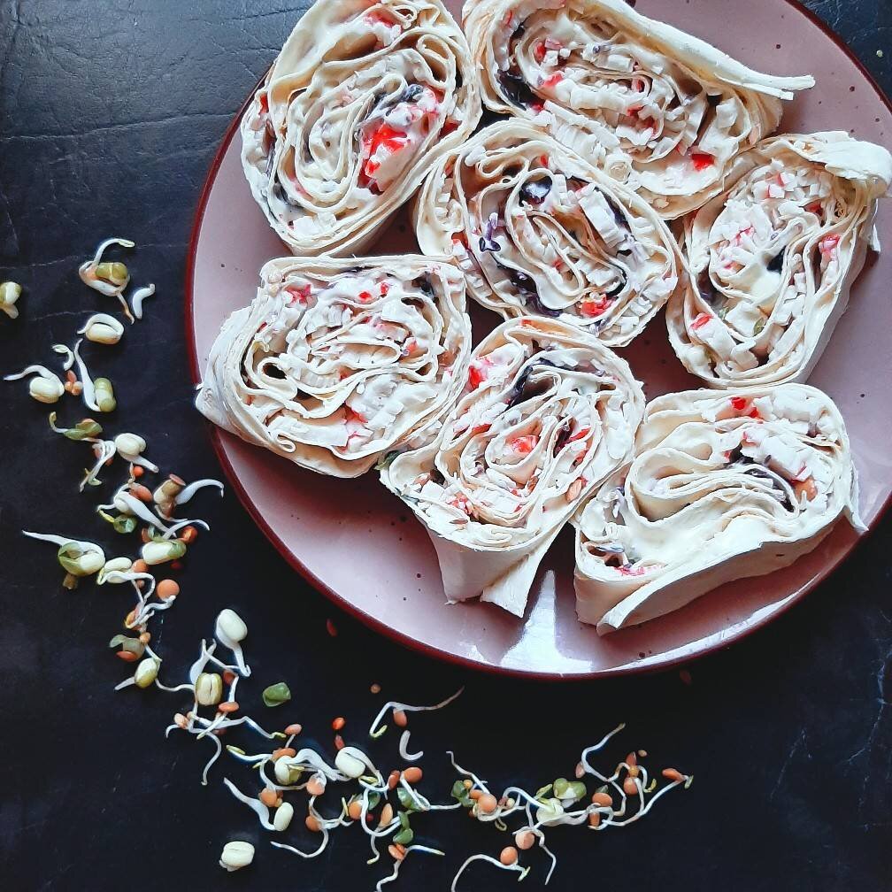 Ингредиенты: лаваша, плавленый сыр , микса из пророщенных зёрен (гречка, маш, зелень горошка), крупных крабовых палочек Способ приготовления: 1 лаваш (у меня резаный, он равен половинке стандартного тонкого лаваша) расстелить на столе и щедро смазать плавленым сыром из баночки. Крабовые палочки мелко нарезать и половиной получившийся массы посыпать лаваш с сыром. Сверху посыпать 1 ст.л. пророщенных семян. Сверху кладём ещё один лаваш, но сантиметров на 5 сдвинув в сторону, чтобы верхний лист был длиннее нижнего. И повторяем все с сыром, крабовыми палочками и семенами. Сворачиваем рулет и режем на порционные куски.