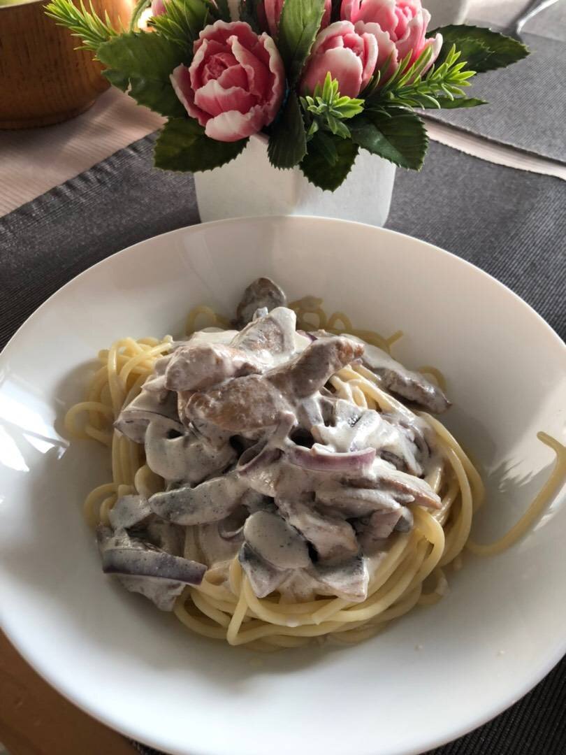 Это очень вкуснооооооо! Попробуйте. ) #паста #вкуснятина #пастаскурицейгрибами #сливочныйвкус Ингредиенты: куриная грудка, шампиньонов, красного лука, спагетти, сливки 20% , соевого соуса, вода Способ приготовления: Куриную грудку нарезать мелко и замариновать в соевом соусе минут на 20. Тем временем отварить спагетти. На сковороде обжариваем курицу до золотистой корочки, добавляем грибы и красный лук, жарим 2 минуты и добавляем воду. Тушим 2 минуты и вводим сливки (чтобы не свернулись, предварительно разогрейте их). Чуть-чуть посолить. Как только сливки станут густеть, снимаем с плиты. Соединяем спагетти и сливочный соус с курицей и грибами! Готово. ✅