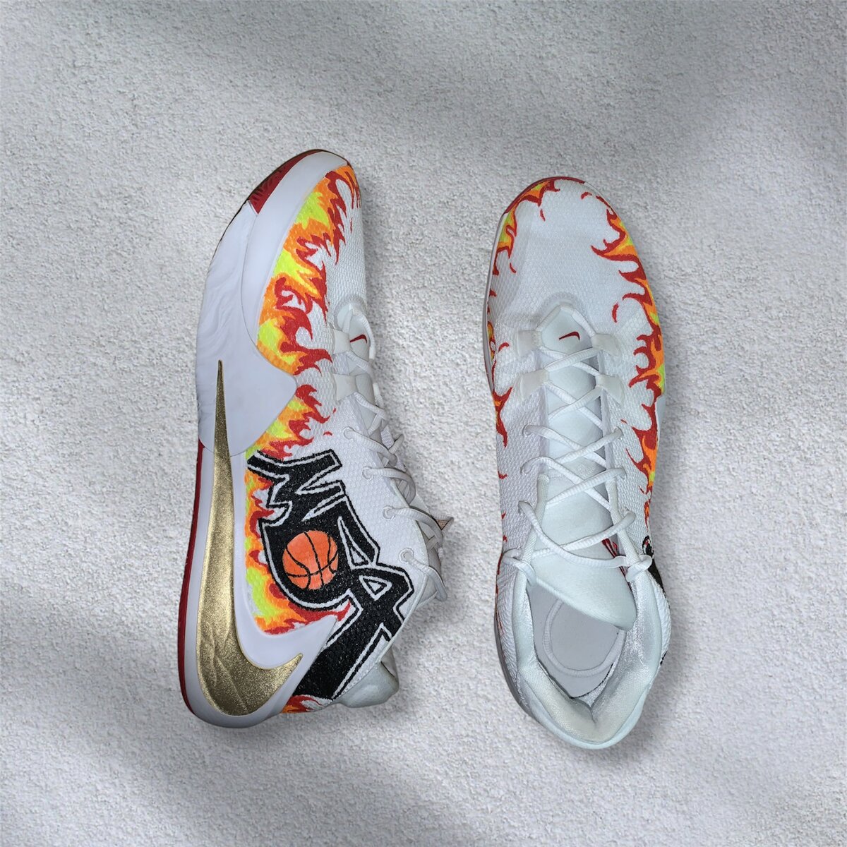 Вы знали что кроссовки - это единственное, что баскетболист выбирает по своему собственному предпочтению? Форму всегда даёт спонсор, а вот кроссовки можно выбрать самому. Фирму, форму, цвет и т.д. Поэтому именно эта часть гардероба спортсмена является той, которую можно персонализировать. Модно написать имя, нарисовать принт и т.д. Вот на Идой работе я как раз писала номер игрока и логотип его команды. Ну и плюс добавила огоньку 🔥🔥 #баскетбольныекроссы #кроссовкикастом #кастомбаскетбол