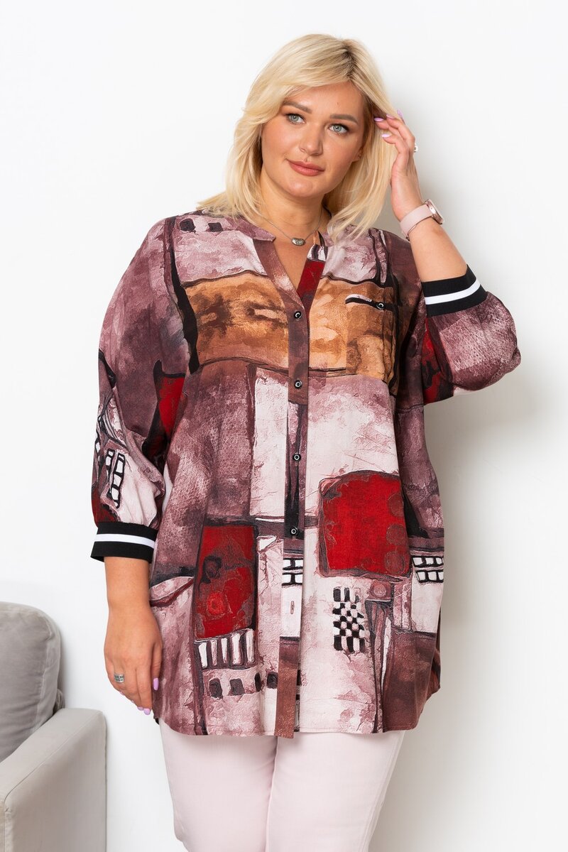 Стилисты хотят и полных женщин сделать стильными. Этот порыв дизайнеров непременно найдет соответствующий отклик в массах. У вас может быть универсальная блузка, которую легко сочетать с разными юбками и брюками. Мечты сбываются... Живописная красота Сегодняшний обзор начинает яркая рубашка в стиле "бохо" с нотками спортивной одежды. Нельзя не заметить необычные контрастные манжеты. Что может быть удобней такого силуэта и беспроигрышного V-образного выреза и застежки на пуговицы? Только то, что блузка рубашечного типа выполнена из легкой дышащей вискозы, а ее живописную палитру легко сочетать с имеющимися у вас юбками и брючками. Офисная классика Если вы не любите многоцветие, то благородная белая блузка с контрастной черной отделкой - ваш вариант. В любом офисе, в любом возрасте, в любом размере смотрится великолепно. Классика же! Есть какая-то недосказанность и прелесть в этой блузке со стрелочками. Блуза свободного кроя с V- образным вырезом хорошо смотрится на фигуре любого типа.