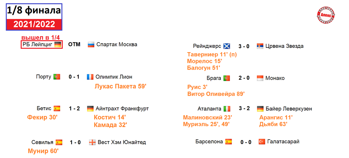 Здравствуйте. В Лиге Европы известны результаты первых матчей 1/8 финала. Голос за кадром подведёт итоги. Спартак исключили из еврокубков, не дав провести игру с Лейпцигом. Немцы автоматически вышли в ¼ финала. Странно, обычно у россиян отбирают медали после побед. В следующей игре Лион, который идёт 9-м во Франции, обеспечил небольшое преимущество перед ответной игрой с лидером португальского чемпионата Порту 1:0. У «драконов» был шанс отыграться, но на 95-й минуте гол отменили из-за офсайда. Последний раз Порту проигрывал 7 декабря прошлого года 18 матчей назад. Айнтрахт из Германии на выезде одолел испанский Бетис 2:1. Немцы упустили возможность увеличить счет, не реализовав во второй тайме пенальти. А вот Бетис 5 игр не знает вкуса побед: 3 поражения и 2 ничьи. Севилья (Испания) минимально победила Вест Хэм (Англия) 1:0. Прежде команды не пересекались. Англичане проиграли три последние игры. У Севильи небольшой беспроигрышный отрезок из трех матчей. Рейнджерс (Шотландия) крупно по