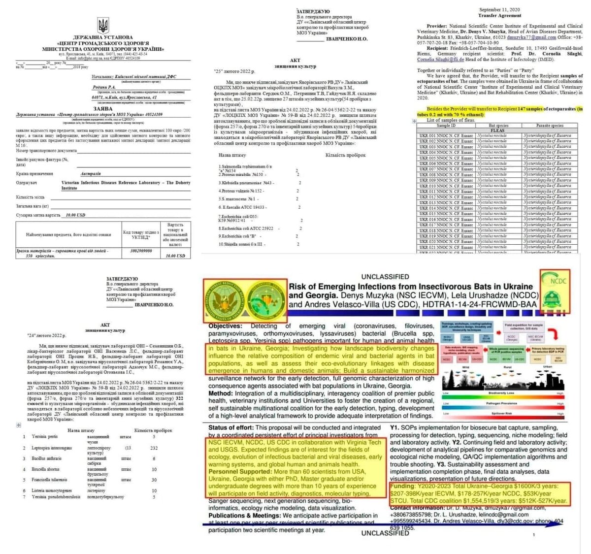 Минобороны РФ сообщает, что стали известны подробности проекта UP-4, который готовился при участии лабораторий Киева, Харькова и Одессы и был рассчитан на период до 2020 года В документах зафиксирован факт передачи биоматериалов из украинских лабораторий в Австралию и Германию, подробно расписан сам проект по изучению летучих мышей, а также проект по изучению мигрирующих птиц UP-4 и протокол отлова в России птиц с Украины. Помимо прочего, ведомство обнародовало и акты уничтожения доказательств в биолабораториях. Все это, по словам ведомства, указывает на то, что США и их союзники намеревались создать биоагенты, «способные избирательно поражать различные этнические группы населения». Как сообщает ведомство, целью проекта было изучение возможности распространения особо опасных инфекций через мигрирующих птиц, в том числе высокопатогенного гриппа H5N1, летальность которого для людей достигает 50%, а также болезни Ньюкасла. По информации Минобороны, выявили минимум два вида перелетных пт