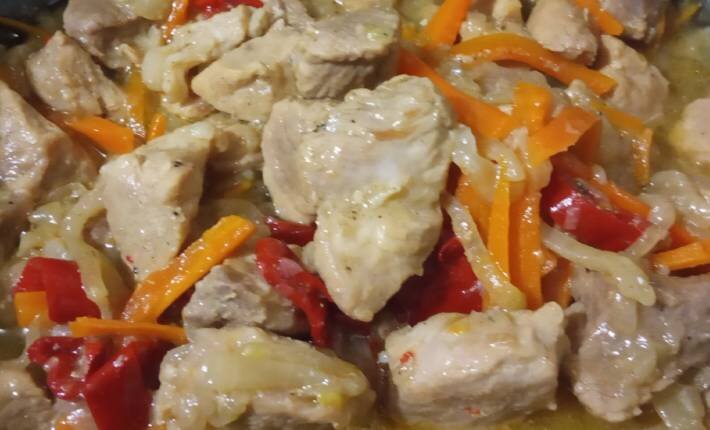 Большинство хозяек сталкиваются с ежедневной дилеммой - что приготовить, чтобы было вкусно и не отняло много сил и времени. Предлагаю приготовить сочное, нежное и очень вкусное тушеное мясо. На мой взгляд - это идеальное блюдо. К нему подходит любой гарнир, на ваше усмотрение. Режем лук 1-2 шт. так, как вам нравится. Я режу тонкими полукольцами, в процессе тушения он все равно станет практически незаметным. Мясо режем кусочками размером примерно 2-3 см. У меня свинина, но также отлично подойдет молодая говядина, или мясо курицы. Чем мельче кусочки, тем быстрее они приготовятся, но слишком мельчить не нужно. Морковь нарезаем брусочками. Не любите морковь, просто пропустите этот шаг. Сначала обжариваем лук на растительном масле (на среднем огне) до прозрачного состояния. Затем прибавляем газ и выкладываем мясо. Обжариваем постоянно помешивая до тех пор, пока не “запечатается” каждый кусочек. Добавляем морковь и жарим еще 2-3 минуты, также постоянно все перемешивая. После этого солим, пер
