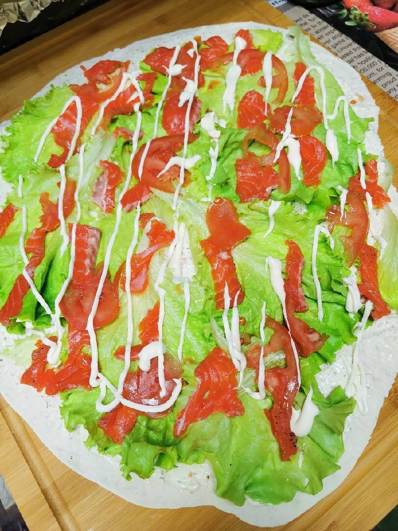 Любимая закуска дочки. Попросила сделать на свой ДР. Ингредиенты: Лаваш, Помидор, Салат в горшочке, Майонез, Плавленый сыр , Рыба красная свежая (лосось, форель) может быть копченая Способ приготовления: Лаваш мажем плотно сыром, затем раскладываем листья салата. Раскидываем рыбку по лавашику (количество на ваш вкус) Мы ❤️по больше😁 Затем нарезаем тонко помидорку, раскладываем и майонезом рисуем,, горную дорогу,, И сворачиваем в рулетик. Можно завернуть в фольгу или пищевую пленку, если под рекой нет выше перечисленного, то можно положить в прозрачный полиэтиленовый пакетик. Ставим в холодильник на 2-3 часа (я делаю на ночь) Хорошо пропитается! Нарезаем на порции шириной примерно 3 см. Выкладываем на блюдо. Очень вкусно и быстро. Приятного аппетита 🤭