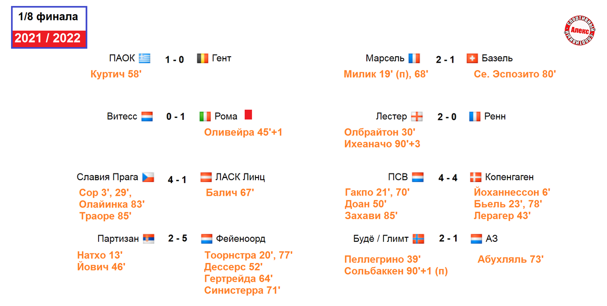 Здравствуйте. В Лиге Конференций известны результаты первых матчей 1/8 финала. Голос за кадром подведёт итоги. Греческий ПАОК победил бельгийский Гент 1:0. В 2017 и 2018 гг. команды провели две товарищеские дуэли. Больше очных встреч между ними не было. Тренер хозяев, сын Мирчи Луческу, получил жёлтую карточку. А его ПАОК не уступает никому 6 матчей. Голландский Витесс проиграл итальянской Роме 0:1. Автор единственного мяча португалец Сержио Оливейра во втором тайме был удалён. Римляне не проигрывают 5 игр подряд. Чешская Славия в конце игры сделал неприличным счет в игре с австрийским ЛАСКом 4:1. 21-летний нигериец Сор забил дубль. Славия продолжает испытывать проблемы с составом. Однако, это не помешало выиграть 7 матчей кряду. Необычный счет зафиксирован в матче сербского Партизана и голландского Фейеноорда 2:5. В составе гостей дублем отметился 32-летний полузащитник Торнстра. У голландцев за последнее время имеется одно поражение в 7 играх. Марсель победил швейцарский Базель 2: