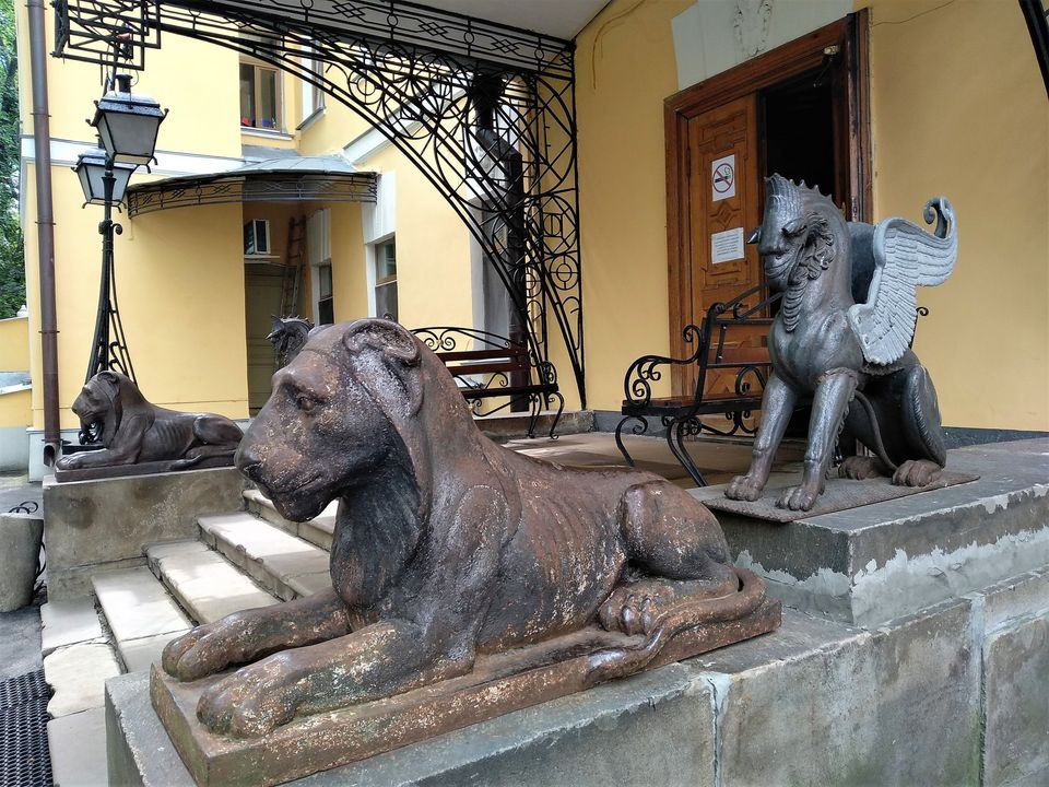 Мирно сидящий в беседке-ротонде Хоботов и, он же, прячущийся внутри старого дерева от гнева Маргариты Павловны…..Аркадий Велюров, спускающийся по пандусу, обрамлённому фигурами бронзовых львов с застёгнутыми на пуговицы ртами, и, спустя несколько минут, произносящий устрашающим голосом монолог на фоне старого грота….Савва Игнатьевич, приобнявший за плечи бронзовую скульптуру и при этом гневно клеймящий Хоботова за то, что он не знает, как надо жить….Наконец, Савранский и его боевой мотоцикл, запечатлённые в окружении пациентов больницы на фоне входных ворот в сад….Знакомые с детства заключительные кадры фильма М. Козакова «Покровские ворота»… Не могу назвать себя «фанатом» этого фильма, но, коль скоро довелось оказаться на месте, где были сняты все указанные выше сцены, не мог не порадоваться тому, что всё (и грот, и скульптуры, и пандус, и ворота) сохранилось до сих пор в почти «киношном» виде. Сад усадьбы Усачёвых-Найдёновых, где, помимо «Покровских ворот», были также сняты кадры фи