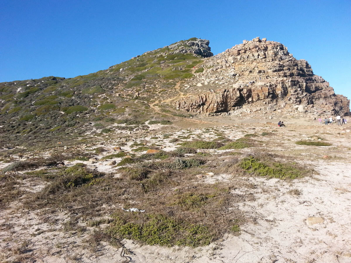 Завершением экскурсии на красном туристическом автобусе фирмы CitySightseeing по Капскому полуострову стала остановка у легендарного мыса Доброй Надежды. И это было откровенное разочарование. Когда оказываешься в каком-нибудь легендарном месте, ожидаешь увидеть невесть что, а тут безжизненный холмик, галечный пляжик. Да географически именно этот мыс является юго-западной оконечностью Африки, но как-то здесь все утилитарно. В 1488 году мыс Доброй Надежды был открыт для европейцев португальским мореплавателем Бартоломеу Диашем и назван мысом Бурь. Экспедиции Бартоломеу Диаша была поставлена задача — найти морской путь в Индию вокруг Африки. До Индии Диаш не дошёл, но стал первым европейцем, который обогнул Африку с юга. Косвенно ему в этом помогли страшные бури, несколько дней трепавшие его корабли. Когда бури стихли, потерявший ориентацию Диаш направился на север, и 3 февраля 1488 уткнулся в побережье, которое «поворачивало» на северо-восток. Так был открыт путь в Индийский океан. Д