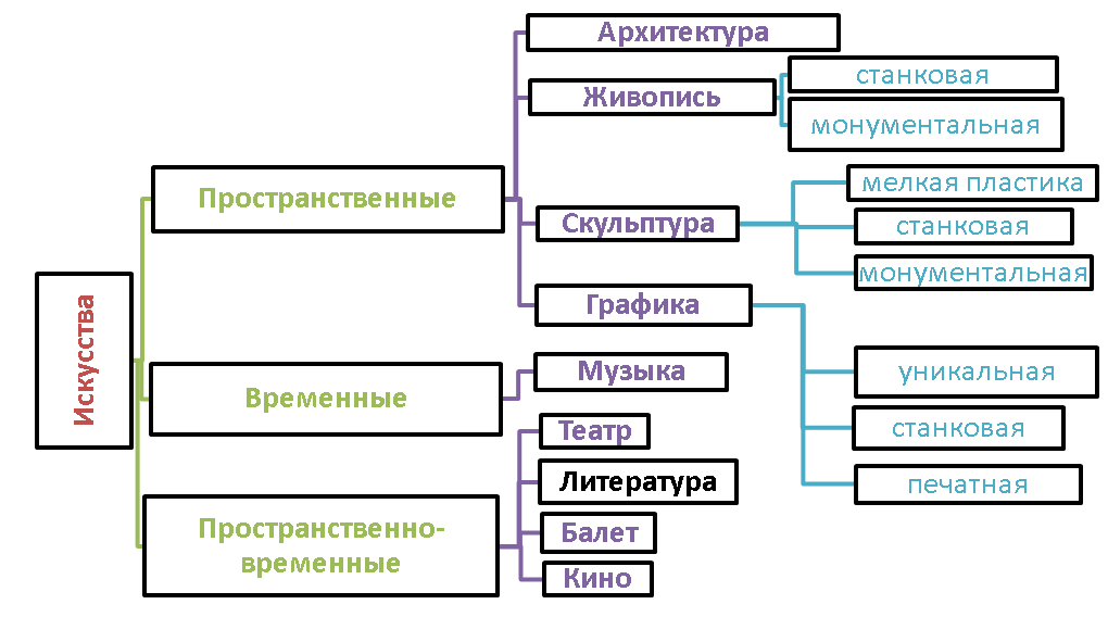 Введение Каждое искусство имеет свою специфику, ставит перед собой особые задачи и обладает для их решения своими специфическими приемами. Некоторые общие черты, свойственные искусствам, позволяют объединить их в определенные группы. Распределение искусств по этим признакам называется классификацией искусства. Классифицирование искусств позволяет поближе подойти к пониманию самой сущности того или другого искусства. Приведем ниже несколько примеров. Классифицировать искусства можно исходя из разных точек зрения. Наиболее распространенной является классификация на пространственные и временные искусства. К пространственным искусствам относят архитектуру, скульптуру, живопись, так как из формы развертываются в пространстве, тогда как музыку, танец и поэзию – к временным искусствам, так как их формы существуют во времени. В иные группы объединяются искусства, если их делить по признаку использования художественных средств – на прямые, или непосредственные, и косвенные, или опосредованные,
