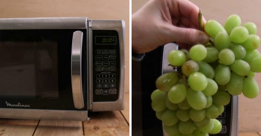 Когда виноград помещают в микроволновку, особенно при разрезании виноградины на две половинки, он начинает гореть. Форма двух половин виноградины и материал преломляют микроволны таким образом, что в итоге они ионизируют содержание натрия и калия в плоде и создают плазму (да-да, реально создается плазма!), из-за чего виноград начинает гореть.
