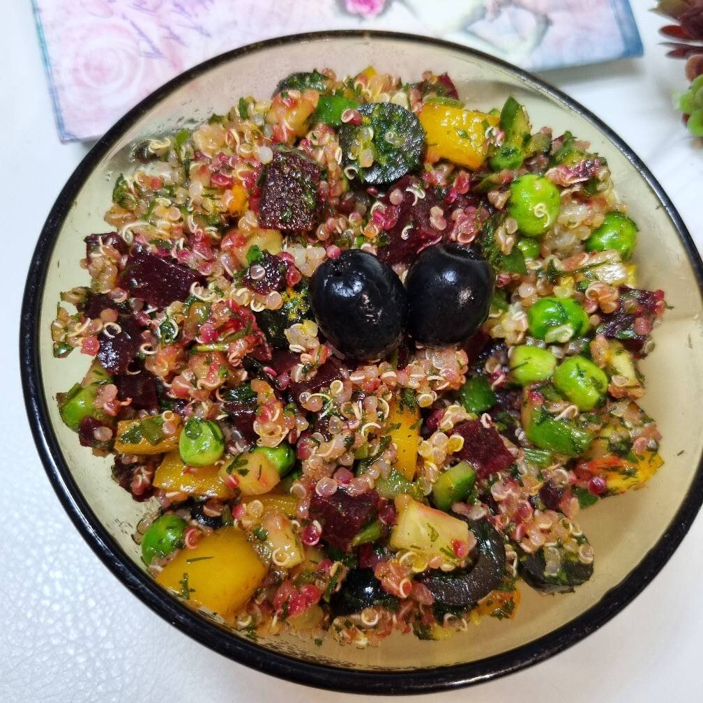 Про крупу киноа можно петь оды, о её богатом содержании белка, это прекрасный источник магния и марганца, протеина, витамина В2, Е, клетчатки и минералов: железа, фосфора, меди и цинка. В сочетании с овощами это просто кладезь витамин которые можно вечером , для тех кто заботиться о своём здоровье. Сытно и вкусно. Проверено👍 Ингредиенты: Крупа киноа, Свёкла средняя, Горошек зелёный замороженный, Огурец, Перец жёлтый, Оливки, Соль, Зелень укропа, Сушеная зелень петрушки, Оливковое масло Способ приготовления: Киноа с вечера залить водой, утром промыть и отварить до готовности. После замачивания готовиться достаточно быстро, варить на медленном огне, дать полностью остыть. Свёклу отварить до готовности в кожуре. В чашку выкладываем киноа, свёклу и огурец порезать кубиками, добавить зелёный горошек. Перец нарезаем кубиками, маслины кружочками, зелень, соль и масло. Всё перемешать и убрать на 30 минут в холодильник настояться. Приятного аппетита друзья.