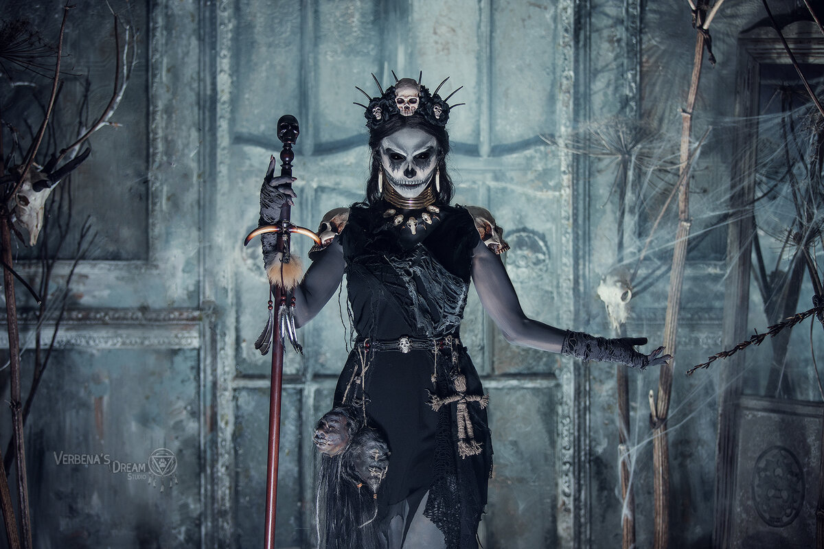 Этоот образ ждал своего часа и своег фотографа наверное года 4. У нас серьезная беда с атмосферными криповыми студиями в Москве. Про улицу речи даже не идет в таких формах. Да и не каждый фотограф готов, любит и может творить в хоррор-стиле. Так вот этот костюм и ждал ,в вялотекущем режиме наполняясь элементами и деталями. Трикотажное платье, обшитое лохмотьями, митенки на руки, постепенно дополнялось плетеным поясом с деревянными бусинами и бляшкой-черепом, с подвешенными на него куклой вуду, лапами ворона и силиконовыми копиями сушеных голов Тсантса. По плечам его украсили вручную разукрашенные наплечники-черепа с черными петушиными перьями, на шее же приютились колье из настоящих черепов летучих мышей и золотой чокер в африканском стиле, а в ушках отлично приладились серьги из клыков кабана. На голову я сделала венок из черных роз с шипами и черепами, и дополнил образ резной деревянный посох с наболдашником-черепом, натуральным мехом и перьями. И вот, когда костюм был уже закончен,