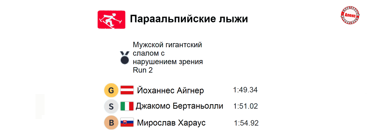 Здравствуйте. На Паралимпиаде в Пекине завершился 7-й день. Вчера обзора не было. Не потому что я плохой, а потому что соревнования отменили. Итак, подведём итоги дня. Начнём с горных лыж, которые были перенесены. В мужском гигантском слаломе с нарушением зрения победил представитель Австрии. Йоханнес Айгнер прошёл дистанцию за 1 мин 49,34 секунды. У итальянца Бертаньолли – серебро, у словака Харуса – бронза. Мужской гигантский слалом. Стоя. Сантери Киивери из Финляндии показал лучший результат 1 мин 55,40 секунды. Его соперники американец Уолш и француз Боче отстали на десятые секунды. Мужской гигантский слалом. Сидя. Йеспер Педерсен из Норвегии выиграл дисциплину с результатом 1 мин 54,20 секунды. Итальянец де Сильвестро – второй. Китаец Зилу – третий. А сейчас соревнования в горнолыжном спорте, которые завершились сегодня. Женский гигантский слалом с нарушением зрения. Вероника Айгнер из Австрии выиграла золото. Её время 1 мин 52,54 секунды. Китаянка Чжу – вторая, Барбара Айгнер – т