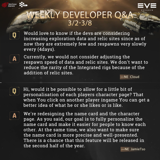 Вопрос: Хотелось бы знать, рассматривают ли разработчики возможность увеличения данных разведки и реликтовых объектов, поскольку на данный момент их крайне мало и они возрождаются очень медленно каждые (4 дня). Ответ: В настоящее время мы не рассматривали бы возможность корректировки скорости возрождения сайтов данных и реликвий. Мы не хотим уменьшать редкость интегрированных установок из-за добавления реликтовых объектов. Вопрос: Привет, можно ли было бы немного персонализировать страницу персонажа каждого игрока? Что, когда вы нажимаете на другого игрока в игре, вы можете получить лучшее представление о том, что ему или ей нравится или нравится. Ответ: Мы переделываем карточку с именем и страницу персонажа. Как вы сказали, наша цель - полностью персонализировать именную карточку и облегчить людям знакомство друг с другом. В то же время мы также хотим убедиться, что именная карточка более точна и хорошо представлена. Есть вероятность, что эта функция будет выпущена во второй половине