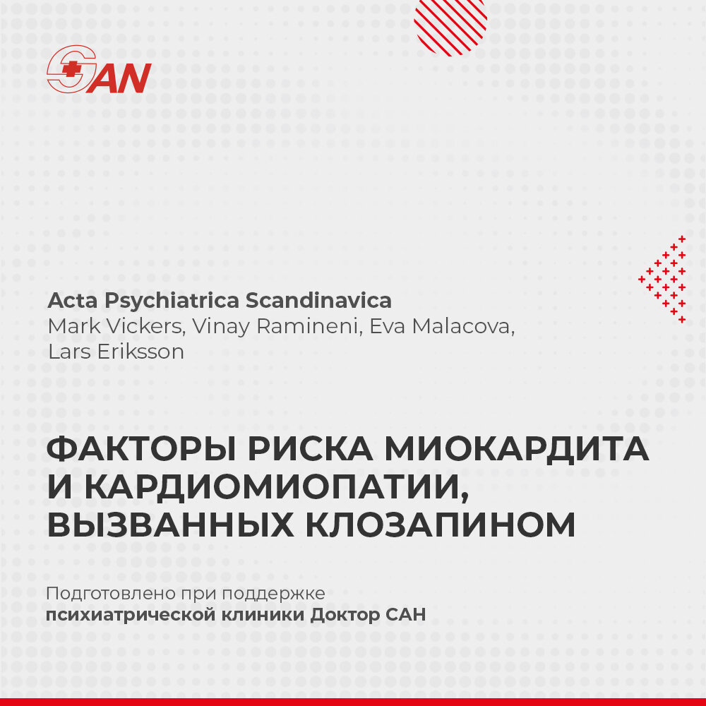 Клозапин является наиболее эффективным препаратом для лечения резистентной шизофрении; однако лечение связано с тяжелыми побочными эффектами со стороны сердца, включая миокардит и кардиомиопатию. Чтобы помочь врачам, пациентам и лицам, ухаживающим за ними, принимать решения о лечении, был проведен систематический обзор и метаанализ для выявления потенциальных факторов риска миокардита и кардиомиопатии, вызванных клозапином. Вероятность индуцированного клозапином миокардита увеличивалась при одновременном применении вальпроата натрия, но не была значительно выше при применении кветиапина, лития или СИОЗС. Были выявлены противоречивые результаты относительно увеличения возраста и повышения дозы клозапина как факторов риска развития миокардита. Никакие другие факторы, включая генетический риск, пол, этническую принадлежность, курение, алкоголь, злоупотребление психоактивными веществами или кардиометаболические заболевания, не были связаны с большей вероятностью миокардита. Факторов риска