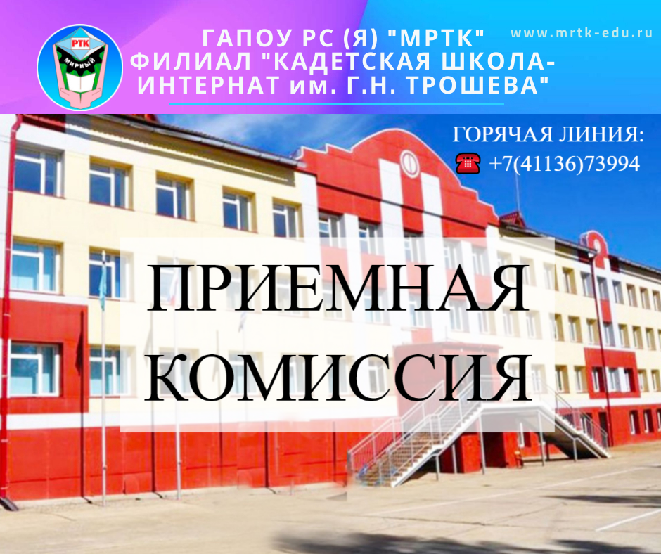 Инструкция о порядке приема документов для поступления в ГАПОУ РС (Я) «МРТК» филиал «Кадетская школа-интернат им. Г.Н. Трошева» Уважаемые родители (законные представители)! с 30 апреля 2022 г. начинается прием документов для поступления в 6-9 классы В Кадетскую школу – интернат им. Г.Н. Трошева принимаются юноши, изъявившие личное желание обучаться в указанном учреждении, годные по состоянию здоровья, прошедшие предварительный отбор, вступительные испытания и конкурсный отбор по образовательным предметам, физической подготовленности кандидатов, проверку психологической готовности к обучению в условиях кадетской школы - интернат. Перечень первичных документов для представления: Все документы могут быть предоставлены в виде цифровой копии или фото. Родители, законные представители, отправляют документы одним письмом. В названии указывают полностью ФИО поступающего и в какой класс поступает. Документы следует отправлять по электронному адресу: cherkshi@mail.ru Одним из основных требований
