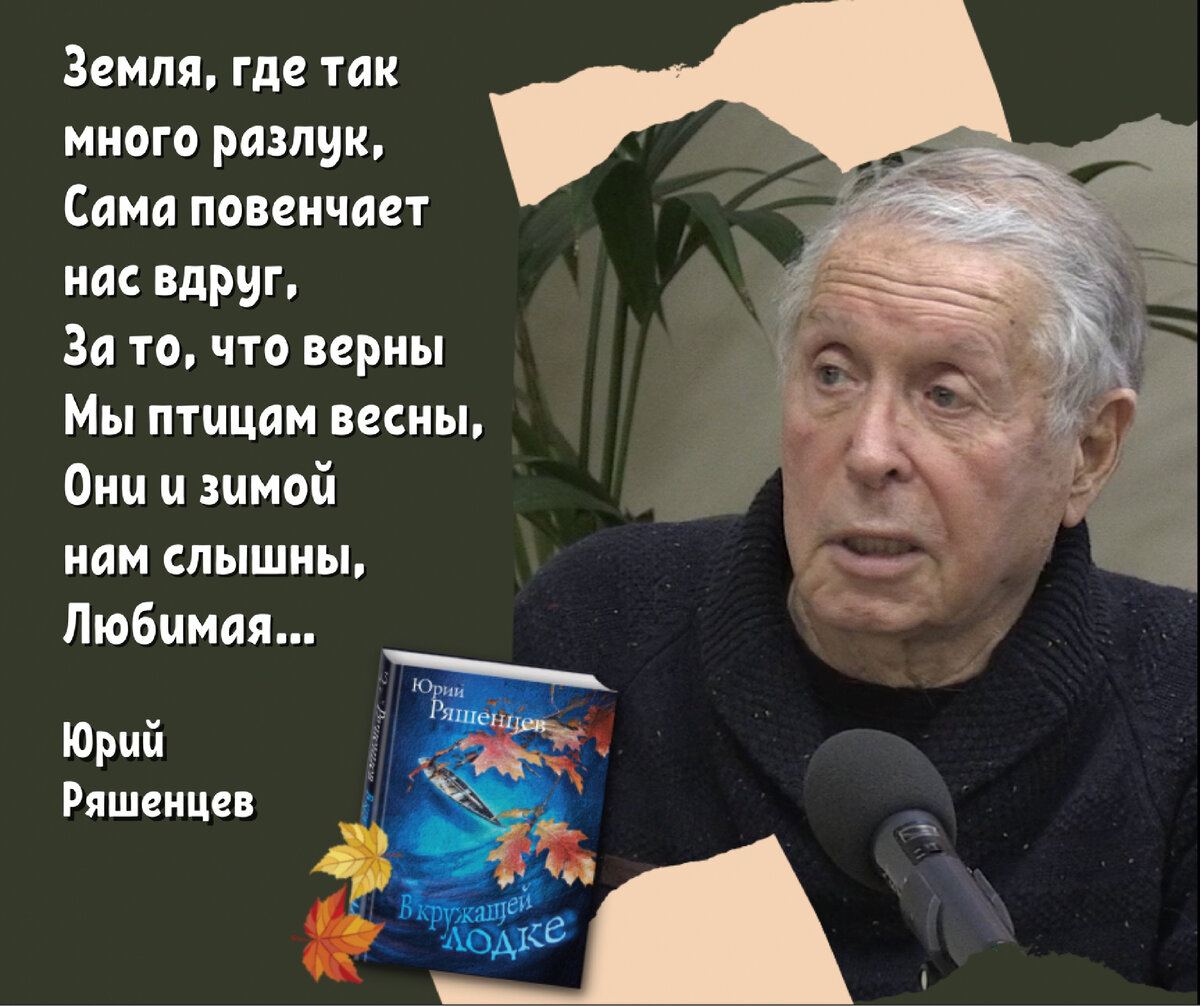 Да, наша страна, по отзывам, Литературоцентирична. Наверное, это правда, Иначе откуда боль? (Юрий Ряшенцев) Юрию Ряшенцеву – девяносто. Совсем недавно поэт пришел в один из старейших книжных магазинов, чтобы рассказать о своих новых книгах. Глядя на подтянутого и стройного Юрия Евгеньевича, поверить в его возраст просто невозможно. Если бы не глаза, в которых отражается мудрость много пережившего человека… Юрий Ряшенцев, поэт, сценарист, переводчик, но, наверное, самое главное – автор песен к культовым кинофильмам «ДʼАртаньян и три мушкетера», «Гардемарины, вперед!», «Веселая хроника опасного путешествия», «Остров погибших кораблей», мюзиклам «Метро», «Джульетта и Ромео», «Пола Негри». Совместно с композитором Давидом Тухмановым они создали известную оперу «Царица», премьера которой состоялась на сцене Александринского театра в Санкт-Петербурге в 2009 году. Ряшенцева называют сторонником классического стиха, техникой которого он виртуозно владеет, всячески экспериментируя с ри