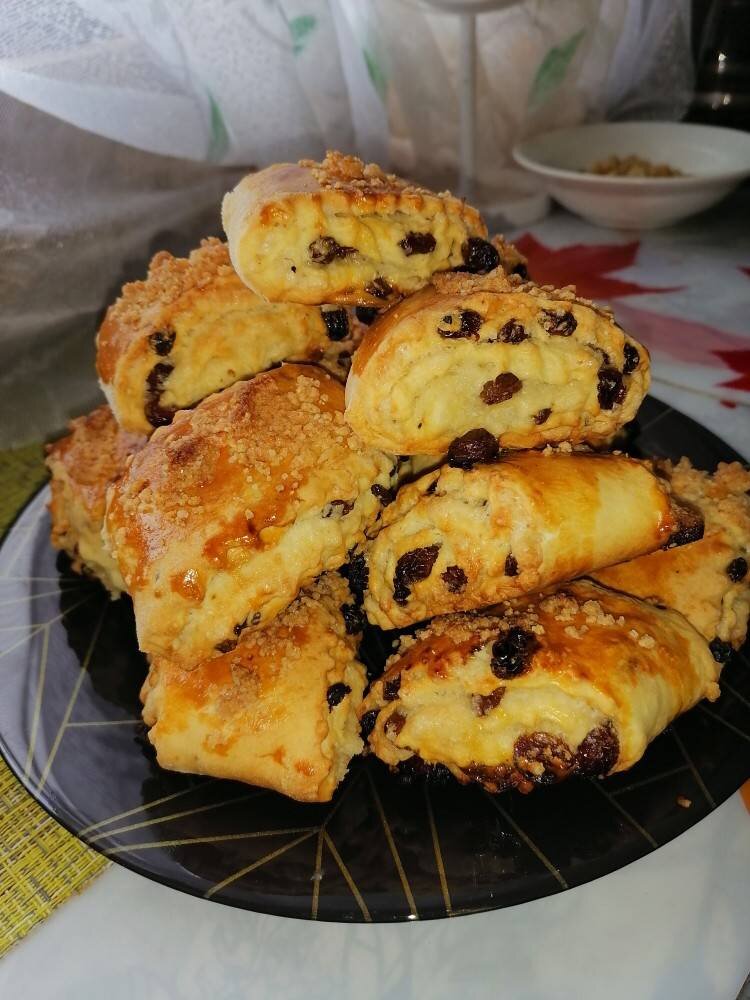 Ингредиенты: муки, кефира, маргарина, яйцо, разрыхлителя, соли, сахара, сливочного масла, муки Способ приготовления: Просеянный. 400 грамм муки. Добавляем туда 150 грамм маргарина. Перемешиваем. Добавляем 1 чайную ложку разрыхлителя, щепотку соли и полстакана кефира все это перемешиваем. И замешиваем тесто. Ставим в холодильник на 30 минут. Делаем начинку. Берём 50 грамм. Сливочного масла. Полстакана муки. 150 грамм сахара. Все это перемешиваем в крошку. И отставляем в сторону. Достаём тесто из холодильника и раскатываем в тонкий пласт. Смазываем и яичным белком. И посыпаем крошку. Сверху ещё можно посыпать изюмом. Можно этого и не делать. Заворачиваем рулет. И немножечко прикатываем скалка сверху. Нарезаем. Треугольники. Можно, ромбики, как хотите, я нарезала ножом для овощей. Смазан сверху яичным желтком и станет за гретую духовку 180° на 20 минут. Приятного аппетита.