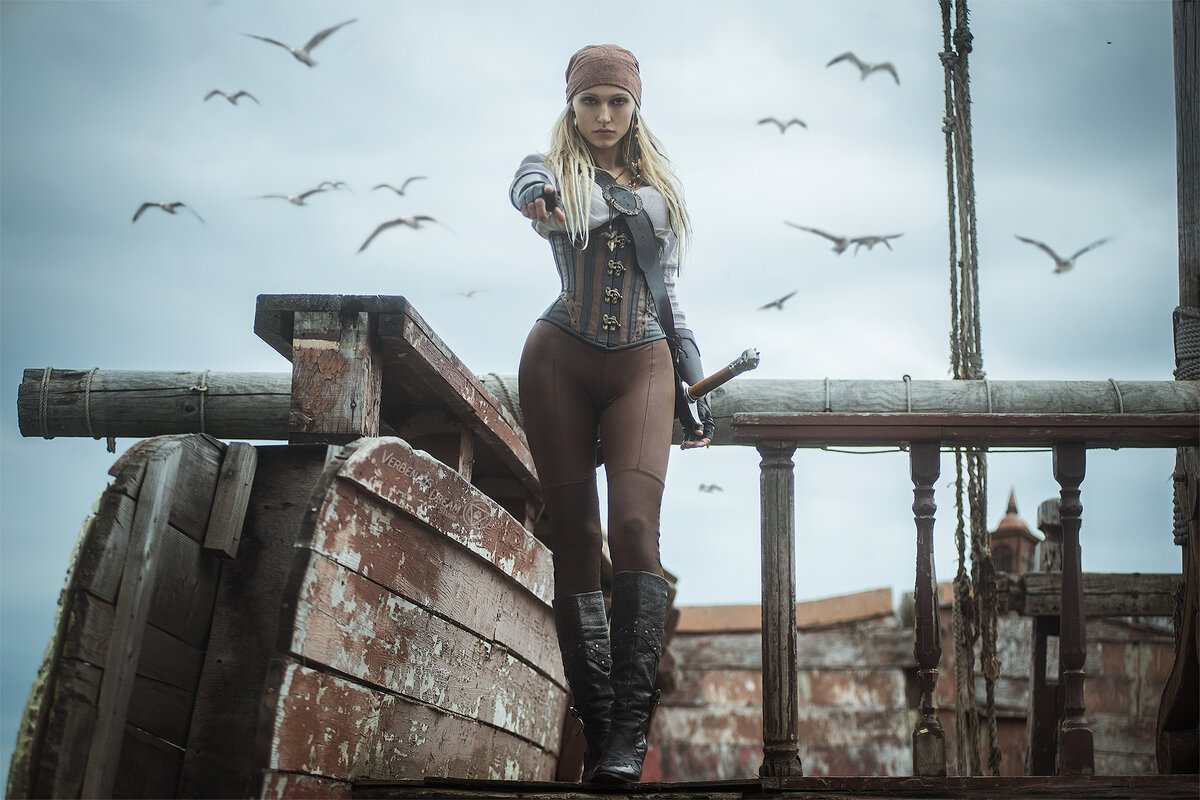 Знайте чувство меры! примерно полгода эта песня крутилась у меня в доме почти ежедневно, потому что мой маленький сын серьезно подсел на фильм "Остров Сокровищ")) Ну и я как заколдованная давай придумывать что-то пиратское, флибустьерское. Ну и вот одно из! Не слишком замороченное такое что прям ах, но вполне в стиле. Костюм флибустьера состоит из коричневой состаренной банданы, белой блузки, леггинс под кожу, коричневого кожаного корсета, кожаных наручей, кожаных сапогов и пиратской кожаной перевязи с пиратской саблей. полный набор, чтобы идти на абордаж)) Снимали снова в локации корабля в киногородке Piligrim Porto, ставшим уже нам как родным. Конечно, над бэкграундом пришлось поколдовать, но оно определенно того стоило! Модель, образ: Дарья Лефлер