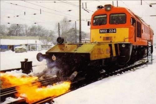Здравствуйте! Вот уже март, а мы так и не рассмотрели вечно больной вопрос для наших погодных условий. Лед и снег, как на вашем пути, так и на наших железнодорожных путях - это в первую очередь проблема. И на рельсах ее уже не обойти, не объехать. Первый вариант борьбы. Просим любить и жаловать: СМ-2 - расшифровывается, как снегоуборочная машина. Фишкой машины является барабан щеточного типа, который расположен поперек рельс в голове конструкции. Задача - забрасывать снег, лед и все что ухватит на "эскалатор", который в дальнейшем закидывает все это добро в вагоны. Но впереди всего располагаются уборочные механизмы и устройства для скалывания льда. Сам поезд в жизни выглядит следующим образом. Так называемый "эскалатор" для снега в действии. Иногда, обычно это делали в советском союзе, на локомотивы спереди прикреплялись ковши, которые на определенной высоте откидывали с рельс все на своем пути. Хотя, например, в штатах так до сих пор делают. Ручные методы Чаще всего имеется необходим
