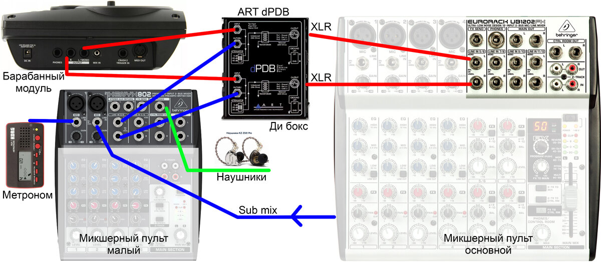 Схема ушного мониторинга для барабанщика. Вариант для электронной барабанной установки. Для себя пока сделал такой вариант ушного мониторинга для репетиций и для концертов. Также, приглашаю всех в наш великолепный и дружный чат Барабанщиков: Линейные выходы L и R из барабанного модуля (в моем случае это Roland TD 11) подключаю стереопару (либо два кабеля) через Ди-бокс к основному микшерному пульту (на концертной площадке: в зал на основной пульт звукорежиссера) Далее из Ди-бокса завожу эти два канала в свой малый микшерный пульт. Также в малый пульт подключаю внешний метроном и Sub mix из основного пульта. В Саб-миксе настраиваю какие, сколько и на какой громкости мне нужны инструменты остальных участников. К примеру: побольше Бас гитары (ибо мы ритм секция, надо держаться вместе и плотно!), умеренно ритм гитара и лидер гитара, умеренно вокал чтобы понимать в каком месте песни находимся а также реагировать на разнообразные высказывания фронтмена, объявление группы, песен, выражение б