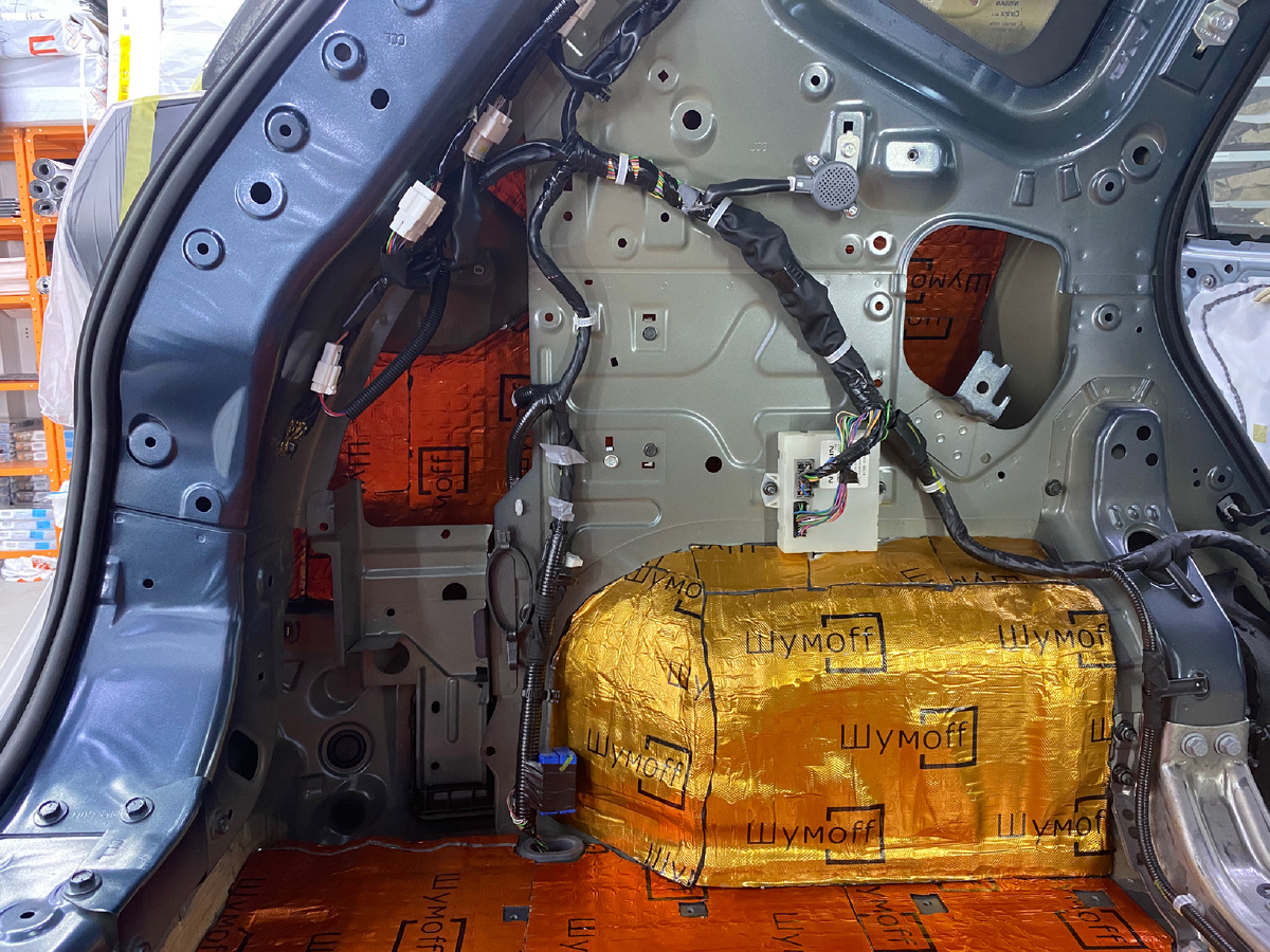 Шумоизоляция багажника! В авто данного типа основной шум в салон исходит из багажного отделения. В целях устранить скрипы, шумы и раздражающие вас звуки советую сделать шумоизоляцию этой части автомобиля! Первым слоем на пол багажника и крылья оклеиваем Шумоff М3, арки у нас достаточно сильно вибронагруженный участок их оклеиваем Шумоff М4 Вторым слоем оклеиваем Герметон 7Л Третьим слоем на арки оклеивается Практик Финиш
