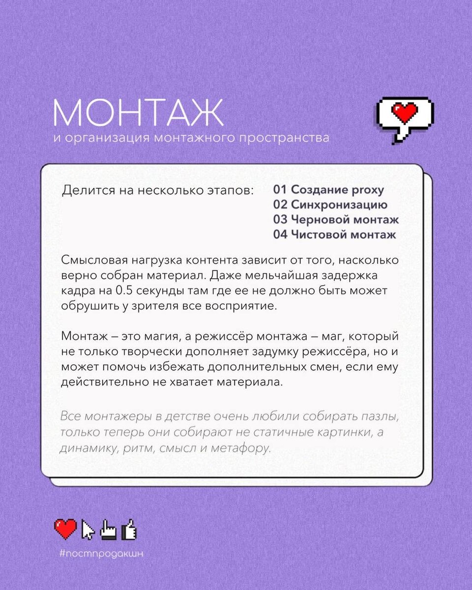 Закроем глаза на чистую статистику и прикинем примерно. Потребителями видеоконтента сейчас являются чуть ли не 100% населения, а знаниями о том, как все варится изнутри — обладают лишь единицы. Уже более 12 лет мы пару раз в неделю объясняем о важности заключительного этапа производства — постпродакшна. — Когда он начинается и зачем нужен? — Сразу после фразы «Снято!». Вот здесь и вступает пост. Важность постобработки трудно переоценить, особенно в нынешнее время, ведь помимо монтажа и цветокоррекции существуют и визуальные эффекты (VFX), которые совершенствуются из года в год. Как правило, постпродакшн состоит из четырех этапов: — Монтаж видеоряда; — Цветокоррекция материала; — Работа с аудио; — Визуальные эффекты (VFX).