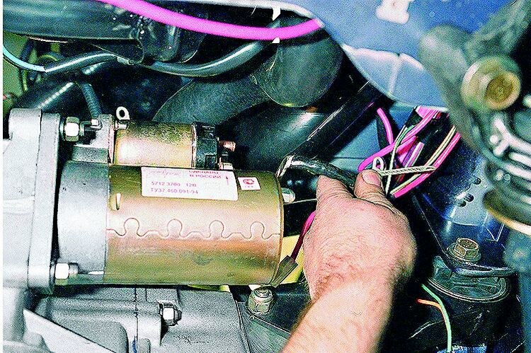 Типичный стартер состоит из электрического двигателя и магнита. Принцип работы прост. Когда мы включаем зажигание и переводим ключ в положение «Start», напряжение от АКБ — аккумуляторной батареи поступает на втягивающее реле — соленоид. В результате сердечник замыкает контакт, который направляет ток на электродвигатель. Приводной рычаг выдвигает бендикс. Он образует сцепку с маховиком коленчатого вала. Начинается вращение.