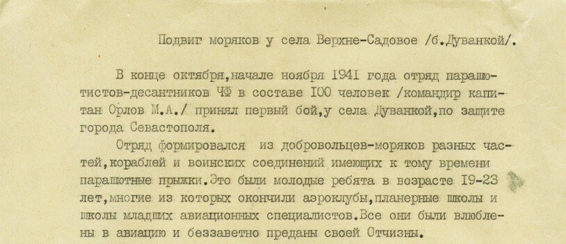 Обычно историю роты начинают с событий на мысу Херсонес и эвакуации нашего командования. Если говорить объективно, то рота была создана еще осенью 1941 года. В начале октября 1941 г. в Севастополе к формированию «Отдельной парашютной роты ВВС ЧФ». Сразу после формирования данной части флотского парашютного спецназа в течение октября 1941 г. личный состав роты начал усиленно проходить все виды боевой, тактической и специальной подготовки. Однако после того, как в конце октября 1941 г. немецкие войска прорвались в Крым и стали продвигаться по направлению к Севастополю, 1 ноября 1941 г. эта рота приняла свой первый бой, и полегла почти полностью. В живых осталось только 12 человек. Место этого боя мы нашли. И, даже одного из бойцов подняли. Но это было первое формирование роты (но далеко не единственное)