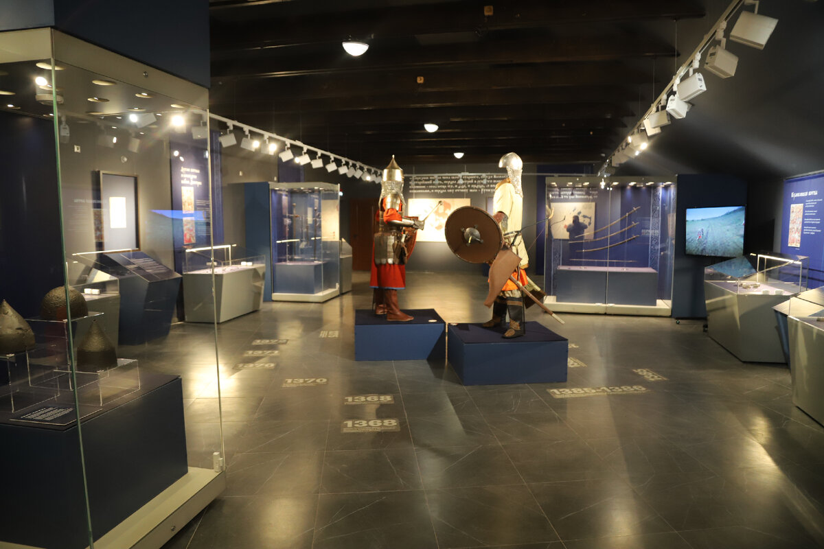Полтора года назад Тула вместе со всем прогрессивным человечеством отмечала 500-летие основания на коренных землях Олы Урда (Великая Орды) крепости - Тульского Кремля. В рамках подготовки к празднованиям улица Металлистов (бывшая Пятницкая) на Посаде, которая шла от Кремля вдоль Упы на запад, была превращена в музейную. Базовой идеей было распределений старых купеческих и ремесленных зданий на улице по различным музеям, которые и должны были отвечать за ремонт и наполнение зданий экспонатами. Одним из таких музеев, которому передали сразу два здания стал Музей-заповедник "Куликово поле". В бывшем доме Лихошерстова на улице Металлистов 8 музей-заповедник открыл экспозицию "Интерактивное пространство. Археология". Сейчас в одном из залов на третьем этаже капитально перестроенного здания работает небольшая выставка «Князь Дмитрий Донской. Жизнь и деяния». Оружие и доспехи 12-15-го веков на территории России не просто редки, а почти уникальны и экспозицию на которой можно увидеть шлемы, сабли, мечи этого времени можно отнести к уникальной.