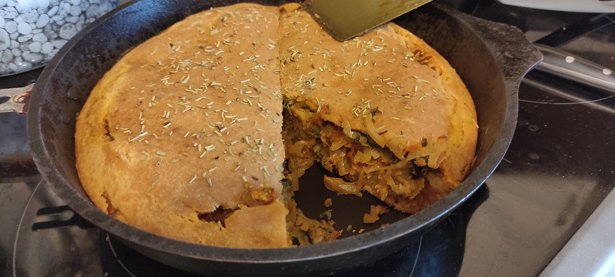 Видимо, в моей жизни наступил период пирогов. Ретроградный Меркурий закончился, и уступил место пирогам. 🤭 С тестом я обычно вообще не дружу, а тут прям не плохо получилось! Делюсь не сложным и быстрым рецептом. Из чего: 🌾🍶Тесто: 2 ст. муки 2 ст. кефира 1/2 ч. л. соды 100 г сливочного или растительного масла 2 ст. л. сахара 1/3 ч. л. соли 🥕🥬Начинка: 1/2 вилка средней капусты 2 листа нори специи: 1/2 ч. л. асафетиды, черный молотый перец, куркума – по вкусу соль по вкусу зелень по вкусу (укроп, петрушка и т.д.) 1 ст. л. кунжута Всего три шага: 1⃣ Потуши капусту с морковкой. Добавь любимые специи. У меня были: копчёная паприка, карри, прованские травы, смесь перцев и соль, разумеется. 2⃣ Замеси тесто. Просто смешай все ингредиенты. Никакой магии, просто всё в чашку и перемешать. 3⃣ В форму выложи половину теста, потом тушёную капусту и сверху залей второй половиной теста. И на 40 минут в духовку. 🆕 И есть одна особенность, так сказать пикантная нотка. Перед "закрытием" пи