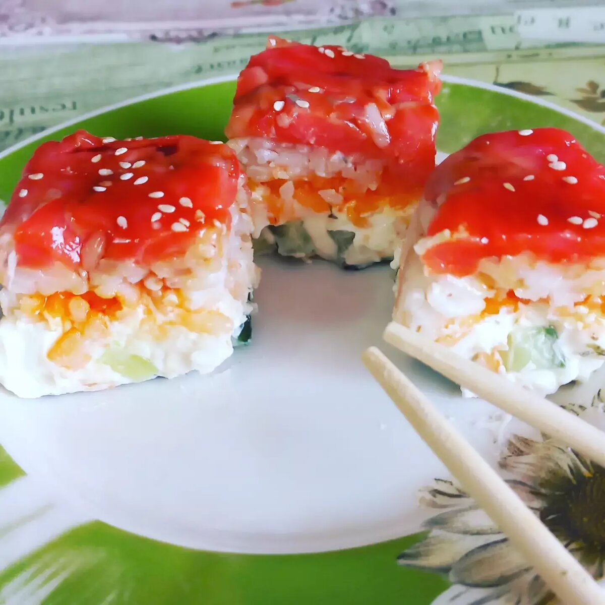 Обалденный суши-торт! Любители суши и ролл обязательно его оценят, тем более готовится он в разы легче, чем роллы или суши. Ингредиенты: слабосоленой красной рыбы, творожного сыра, риса для суши/ролл, свежего огурца или авокадо, Острый кавказский соус, Соус терияки, Кунжут, Для заправки:, рисового уксуса, , сахара , соли, нори Способ приготовления: Сварить рис и смешать с заправкой. Нарезать рыбу, огурцы/авокадо кубиками. Форму застелить пищевой плёнкой, чтобы свисали края. И начинаем выкладывать торт слоями: рыба, рис, острый соус, творожный сыр, огурец или авокадо, творожный сыр, лист нори. Можно добавить слой из крабовых палочек и повторить ещё слои риса,огурца и рыбы, тогда обязательно ещё слой листа нори примерно посередине, чтобы торт держал лучше форму. Сверху накрыть пищевой плёнкой и хорошо притрамбовать каждый слой. Ставим в холодильник минимум на 30 минут, чем дольше, тем лучше будет держать форму торт. Достать из холодильника, перевернуть форму с тортом на плоскую тарелку.