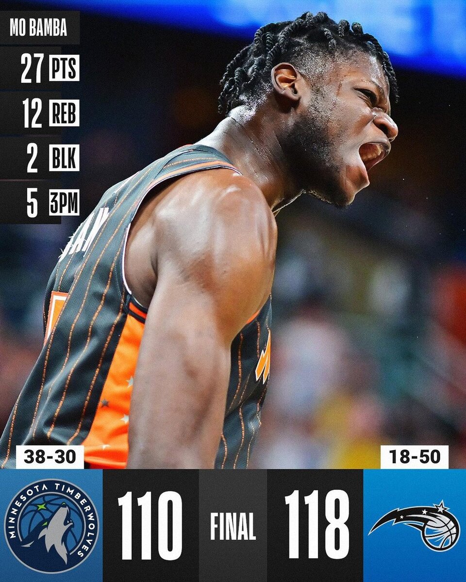 Первый матч за сегодня Мэджик Тимбервулвз. Первую половину Тимбервулвз вели со счётом 65 60. Во второй половине Мэджик со счётом 110 118 вырвали победу. Мэджик были лучше и в проценте попаданий с игры, и в проценте с трёшки. На штрафную линию Мэджик выходили почти в два раза больше, но реализовали с меньшим процентом( Мэджик 22 из 25, Тимбервулвз 13 из 13). Мне кажется в Тимбервулвз тнехватка нормальных центровых, хоть и есть Таунс, но он сегодня не справился с Мо Бамбой и с Картером Джуниор(У Мэджика 58 подборов, а у Тимбервулвз 40). Лучшими у Мэджик были: Картер Джуниор(20 pts 10 reb 5 ast) и Мо Бамба(27 pts 12 reb 2 blk). У Тимбервулвз лучшими были Эдвардс(25 pts 3 reb 5 ast) и Карл Энтони Таунс (21 pts 13 reb 4 ast 2 blk 2 stl).