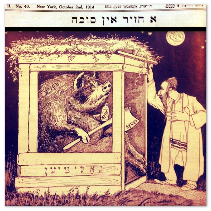 Антирусская карикатура из нью-йоркского издания на идиш от 2 октября 1914 г., за два дня до Суккот, посвящена русской оккупации Галиции. На заголовке написано «Свинья в сукке». На свинье написано «фоня» — уничижительное обозначение русских на идиш, в руке у свиньи топор с надписью «погром» и бутылка с надписью «водка». Знали бы, что этот фоня отворит ворота Аушвица...