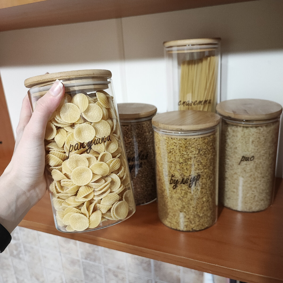 Наверно этим вопросом задаются многие. Я считаю, что удобнее всего хранить в стеклянных баночках с наклейками. У меня вот такие баночки с бамбуковой крышкой из магазина "Домовой". Точно такие же видела на Ozon, если нужна подборка - напишите в комментариях. К ним заказала прозрачные наклейки с чёрными надписями на Ozon. Выбрала вариант на свой вкус. Стоят большие наборы наклеек 150-300р. Для вас нашла несколько интересных вариантов: В поисковой строке Ozon вводите коды и вам выпадают ссылки на товары. А ещё если у вас дома есть принтер, то такие наклейки можно печатать самостоятельно. Необходимо только в любом редакторе создать надписи (тут уже только ваша фантазия) и распечатать на самоклеющейся бумаге. Надеюсь мой лайфхак поможет вам добиться порядка в кухонных шкафчиках и избавит, как сейчас модно говорить, от визуального шума❤ PS: а мне будет приятно если поставите лайк или оставите комментарий