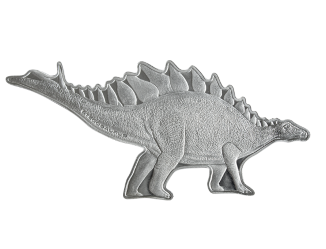 Соломоновы Острово выпустили коллекционную монету, в виде силуэта стегозавра. Стегозавр (лат. Stegosaurus) — род позднеюрских травоядных динозавров, существовавший 155—145 млн лет назад. В его составе выделено три вида. Благодаря шипам на хвосте и костяным пластинам на спине являются одними из самых узнаваемых динозавров. На реверсе монеты необычной формы приводится изображение стегозавра. На аверсе 5 долларов находится скелет стегозавра вместе с весом и пробой серебра, портретом Елизаветы II. Состав - Ag 9999-й пр.; Масса- 62.2 гр.; Размеры - 79.1 на 37.1 мм; Технология изготовления - реверс пруф; Тираж - 2 тысячи экземпляров.