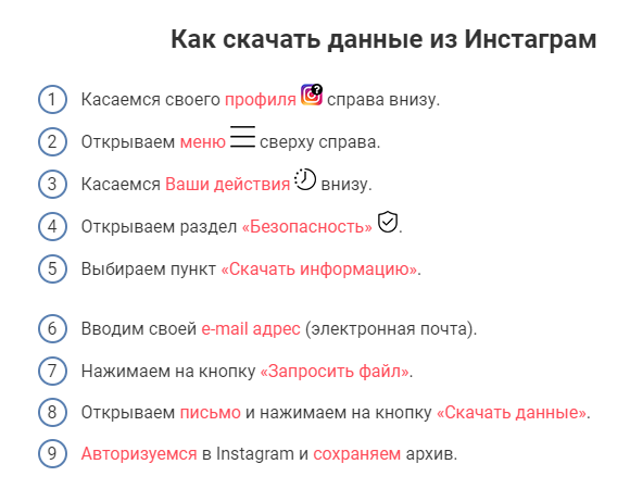Зайти в свой Инстаграм и действовать по инструкции Лучше если инструкция будет на компьютере, а Инстаграм в телефоне, а телефон у вас в руках И не забудьте сразу же скачать данные, когда они придут к вам на почту! Всем добра! Риэлторы из Красноярска. Компания "Спинч" на Шевченко д.44 +7(391)272-80-94
