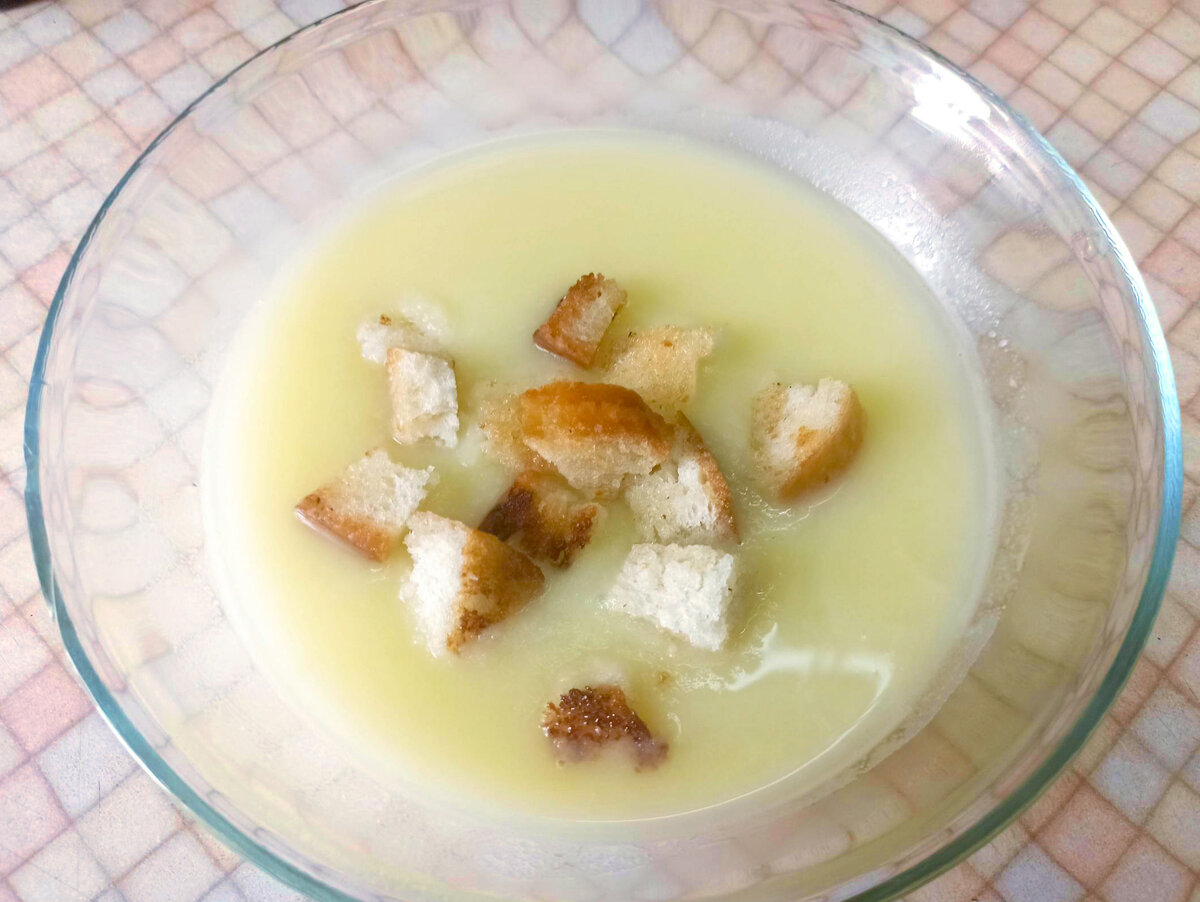 6. Соль, перец по вкусу Приготовление: в холодную воду кладём кусочки курицы и варим бульон. Курицу кладём именно в холодную воду, тогда бульон получится ароматнее и насыщеннее. Как только снимем пену, положим туда морковь и лук. Курица варится быстро и поэтому, картошку кладём минут через 20. Кладём целиком, если она крупная, то режем пополам. Когда курица и картошка будет готова, достаём лук и выкидываем его. Картошку и морковь протираем через сито прямо в тарелку и заливаем бульоном. Посыпаем сухариками и можно кушать. Сухарики готовим заранее. Кусочки хлеба нарезаем на кубики и подсушиваем на сухой сковороде до золотистого цвета и хруста. Приятного аппетита!