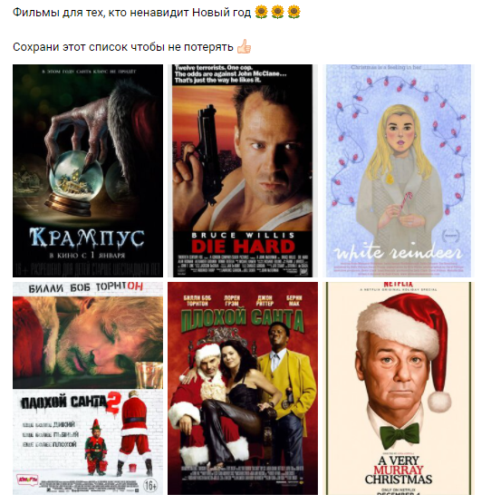 https://vk.com/filmstok Запаситесь мандаринами и включайте телевизор Не переносите новогоднюю суету? Считаете этот праздник переоценённым? Специально для вас мы подготовили подборку нестандартных новогодних и рождественских фильмов, в которых торжество – лишь фон для повествования.