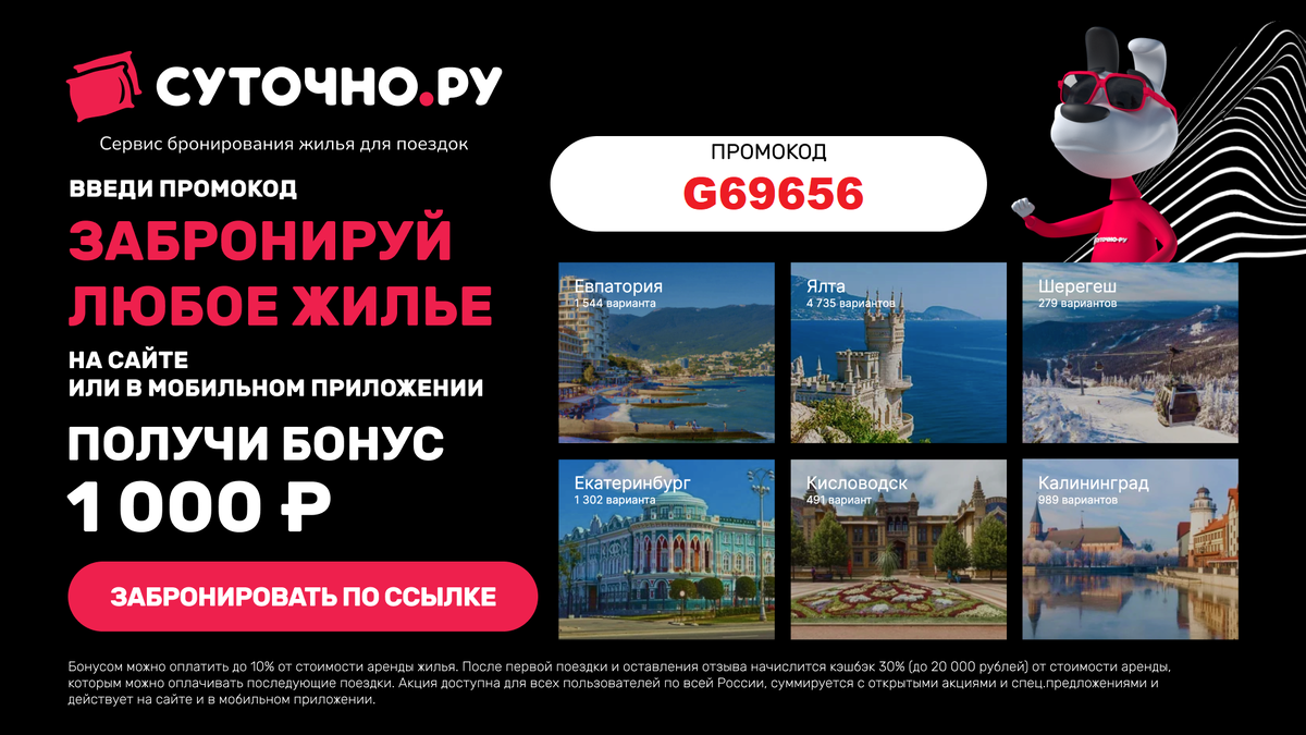Друзья, мы знаем, что у многих из Вас планировали отдых за границей на весенние каникулы, майские праздники и на лето. Сейчас непростая ситуация и мы не знаем чем она закончится, будут ли перелеты, не начнут ли отменять брони туроператоры, что будет с курсом. Но мы точно знаем, что в России много замечательных мест для отдыха, красивых городов, Черное, Балтийское, Азовское моря, озера: Байкал, Ладожское, Таймыр, Селигер. Есть где развернуться! Хорошо ездить в гости в родственникам и друзьям, когда знаешь, что проблем с жильем не будет. А если в выбранном вами месте нет ни родственников, ни друзей, ни знакомых? В этом случае для поиска рекомендуем воспользоваться сервисом Суточно.ру Этот сервис имеет ряд преимуществ: — Более 100 000 вариантов проживания на любой вкус: квартиры, апартаменты, отели, мини-гостиницы и другие варианты. — Комиссия 0% — вы платите только за проживание, никаких скрытых комиссий и наценок. — Кэшбэк 30% (до 20 000 рублей) от стоимости аренды, которым можно