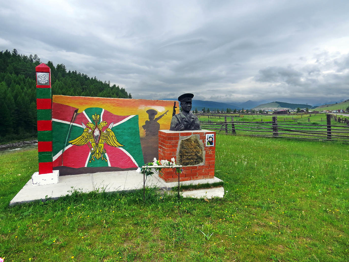 На спуске с гряды в последнюю Мондинскую котловину мы упёрлись в шлагбаум погранзоны. Гражданам России здесь достаточно паспорта, однако на КПП у въезда в Монды работают по старинке - проверяют всех и вбивают их данные в какую-то базу, да так, что при трафике 2-3 машины в час тут нередко собирается очередь. Я отошёл к памятнику - российским пограничникам вообще и убитому контрабандистами под Кяхтой в 2011 году местному уроженцу Батжаргалу Манзапову в частности. Мои попутчики, тем временем, расспрашивали молодого бурята в униформе о том, что здесь можно посмотреть, и он отправил их к водопаду, что было мне по пути. Монды - крупное (1 тыс. жителей), но безликое село: А за Иркутом - развилка. Прямо, мимо субурганов и будд асфальтовый Тункинский тракт ведёт в Монголию, через 40 километров упираясь в Хубсугул - крупнейшее в той стране пресное озеро, которое называют ещё Младшим братом Байкала. Посёлок Ханх за погранпереходом связан с Иркутском крепче, чем с Улан-Батором, а в 1