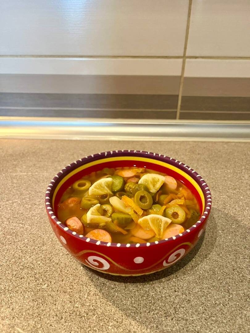 Ингредиенты: Лук, Сосиски, Морковь, Картофель, Солёные огурцы, Оливки, Лимон, Томатная паста, Соль, перец Способ приготовления: Картофель нарезать кубиками, бросить в кипящую воду. Сосиски нарезать кружочками и обжарить на растительном масле. Затем переложить в кастрюлю с картофелем. Морковь натереть на терке, лук нарезать мелко, обжарить 5 минут. Затем к овощам добавить томатную пасту и потушить. Нарезать оливки, огурчики, лимон и добавить в кастрюлю, дальше добавляем тушенные овощи, все вместе варим 10-15 минут, солим, перчим по вкусу. ПРИЯТНОГО АППЕТИТА!!!