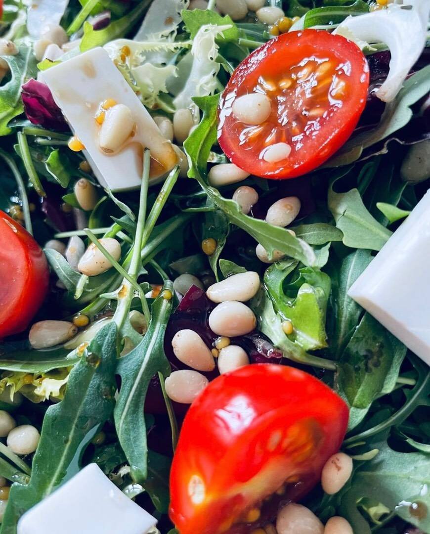 Просто красивый и лёгкий салат. Можно как гарнир подавать с мясом. Можно на диете на ужин))) Приятного аппетита! Ингредиенты: Помидоры Черри, Сыр «Фетакса», смесь из рукколы и радичио, Горчица зернистая, Масло оливковое, Соевый соус, Сок лимона Способ приготовления: Руколлу промойте и просушите. Выложите в тару. Помидорки промойте, нарежьте напополам и добавьте в салатницу. Фетаксу режем и добавляем к салату. Украшаем кедровыми орешками. Заправка: оливковое масло, сок лимона (по вкусу), ст. ложка соевого соуса, ч/л зернистой горчицы.