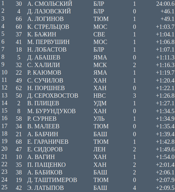 Белорусский биатлонист Антон Смольский выиграл спринт в борьбе за награды Кубка Союза биатлонистов России. Вторым стал его партнёр по команде Лазовский, а бронзой отметился Александр Логинов, который на финишном круге не удержал второе время