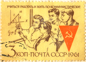 Марка СССР со слоганом: «Учиться работать и жить по-коммунистически!»